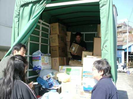 いつも日曜日に無料で駐車場をお借りしている教会のお隣の板金屋さんにもカセットボンベやトイレットペーパー、紙おむつなどをお裾分けしたところ、とても喜ばれました。遠いところを駆けつけて下さったお二人の先生方、そして全国の教会の皆さんに心から感謝します。たくさんの物資をいただいて、ピリピ4章の後半を思い出しました。