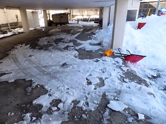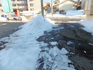 雪国ではない地域にお住まいの方のために説明しますが、雪が降ると人々がせ っせと雪かきや雪下ろしをするのは、そのまま放っておくと凍ってしまい、処理 するのがもっと大変になるからです。まだ軟らかいうちに雪かきをする必要があ ります。それでも、処理しきれずに地面に残った雪は、一晩もすれば凍ってしま います。そうなると、軽くて便利なポリ製の雪かき用スコップではどうすること もできません。アルミ製のスコップを持ちだしてきて、雪を割って砕きます。そ のための道具もあるそうですが、仙台では滅多に使いませんから、スコップでや っています。