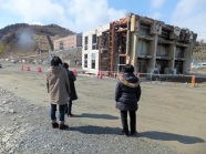 最初に訪れたのは、児童と教職員合わせて84名が津波の犠牲となったことで知られる大川小学校でした。小雪がちらつき、北風が吹き付ける寒さの中、ご遺族をはじめとして、いろんな方々が次々と訪れていました。我が子を失った遺族の方々が、石巻市を訴えて裁判を起こしています。あの地に立ってみると、児童たちが目ざした北上川にかかる新北上大橋付近ではなく、学校のすぐ裏手にある山を登っていれば助かったに違いない、と遺族たちの悔やんでも悔やみきれない思いは分かる気がします。周囲には学校以外の建物は何もなくなり、寒さの中でいっそうさびしく感じました。*写真の後に続いていきます