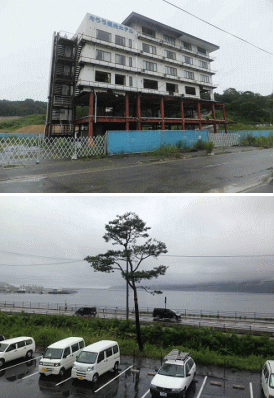 また、ニュースなどで知られた宮古市田老地区にある田老観光ホテルにも立ち寄りました。6階建てのホテルが、高さ17メートルを超えるとも言われる津波により4階まで浸水、2階までは柱を残して完全に流失するなど大きな被害を受けました。震災遺構として残されることが決まっています。