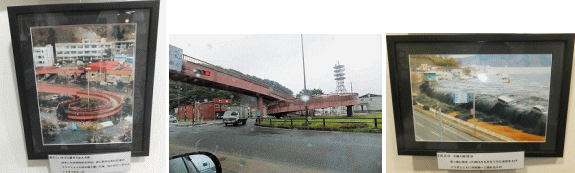 お昼を済ませ、「さあ、このあとどうしよう?」となりました。台風の雨で、観光どころではありませんでした。ホテルは午後5時以降のチェックインという予約でしたので、4時間近くどこかで時間をつぶさなければ、となりました。ホテルの近く、浄土ヶ浜ビジターズセンターに行くと、三陸海岸の紹介があったり、東日本大震災の津波被害についての説明がありました。津波の被害を紹介した写真パネルは、どれもテレビなどで何度も目にしてものでした。変わった形の歩道橋がガレキで埋まっている写真、さきほど通ってきた道路でした。また、黒い波があふれて車や漁船が道路に落ちてくる光景など、これも「さっき通ってきた道路だ!」と分かりました。テレビで映像として見るのと、実際に訪れるのとでは、やはり違うものがあります。ずっと身近なものとして感じるようになりました。