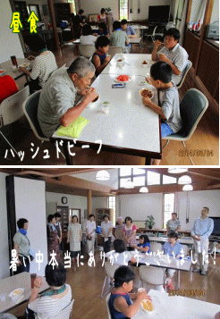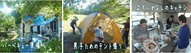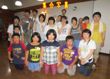 その間、外ではいよいよ本格的にバーベキューの準備。今年は、M家のTくんが初めて、M家伝統のやきそば作りに参加。おじさんの手ほどきを受けながら、伝統の味を引き継ぐべく、見習い?を始めていました。分級が終わり、6時からバーベキュー。お腹をすかせた子どもたちは、静かに黙々と焼肉を食べていました。夕食の後、遅れて到着したSくんの食事が済んだところでみんな揃って集合写真をとりました。