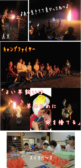 それに続いて、メインイベントの一つ、キャンプファイアー。無事に点火がなされた後、CSの先生たちと生徒たちによる恒例のスキットが行われました。題目は迷子の羊。羊飼いのおじさんに扮した先生たちが、羊の帽子をかぶった迷子の羊を探します。やっと見つけると、羊をおぶって帰るのですが、中には少々重たい羊もいて、先生たちもさぞかし大変だったことでしょう。おかげでこちらは今年も楽しませていただきました。