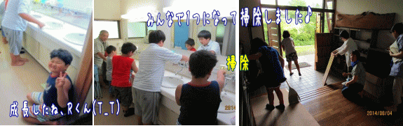 昼食のときには、キッチンの奉仕者をはじめ、このキャンプを支えてくださった教会の方々に感謝を表しました。毎年のことですが、このキャンプのために、教会の多くの方々が様々な形で奉仕に加わり、支えていてくださいます。本当に感謝です。その大人の方々の奉仕に感謝して、最後は子どもたちがみんなでドミニコの家の掃除をしました。男の子たちが、O先生の指導のもと、そろって洗面所のお掃除。去年の今頃は泣いていたRくんもピースサインをしながら床の拭き掃除をしていて、感動しちゃいました。教会の方々が皆さん言っておられましたが、子どもたちの1年の成長は目を見張るばかりで、一年前のあの子たちが、先生の言われるとおりに掃除に励むなんて、スゴい!