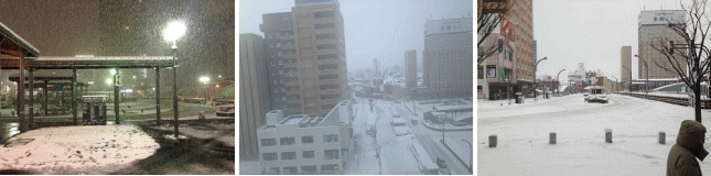 した。今年は暖冬で、本格的に雪が降ったのは初めてとのこと。日曜日の朝には20センチ近く積もりました。仙台でこのぐらい降るのはひと冬に2、3回でしょうか。弘前あたりでは当たり前の光景のようです。前回、弘前に行ったときには、教会の目の前の川をカモが気持ちよく泳いでいましたが、昨日はその姿が見えませんでした。帰りの電車の車窓から見た、雪に覆われたりんご畑、これが青森の冬の風景なんだなあという感じがしたことでした。