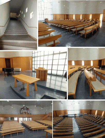 そのような関わりをもありまして、わたしが年会講演の担当をさせていただき、坂野先生と打ち合わせをさせていただくことになりました。昼食をご一緒させていただいた後、2006年2月に完成した立派な会堂を坂野先生にゆっくりと案内していただきました。たくさん写真を撮ったのですが、ほんの一部だけ紹介します 北浦和駅からわずか500メートル、大きな道路に面しているとても良い場所に、550 坪という広さ。玄関を入ってすぐ左に小チャペルがあり、ゆるやかにカーブしている素敵な階段(礼拝堂に向かって心を整えていく巡礼の道のような階段)を上って2階が多目的ホール、そして3階にチャペルがありました。上から見るとよく分かるのですが、説教壇と聖餐卓を囲むようにして会衆席があります。どれを見ても、その見事さにため息ばかり出たのですが、チャペルに入ったとき、ただ見学するだけでなく、「ああ、ここで礼拝をささげたい」という思いになりました。いつか夏休みにでも、礼拝に伺いたいなあと思わされたことでした。